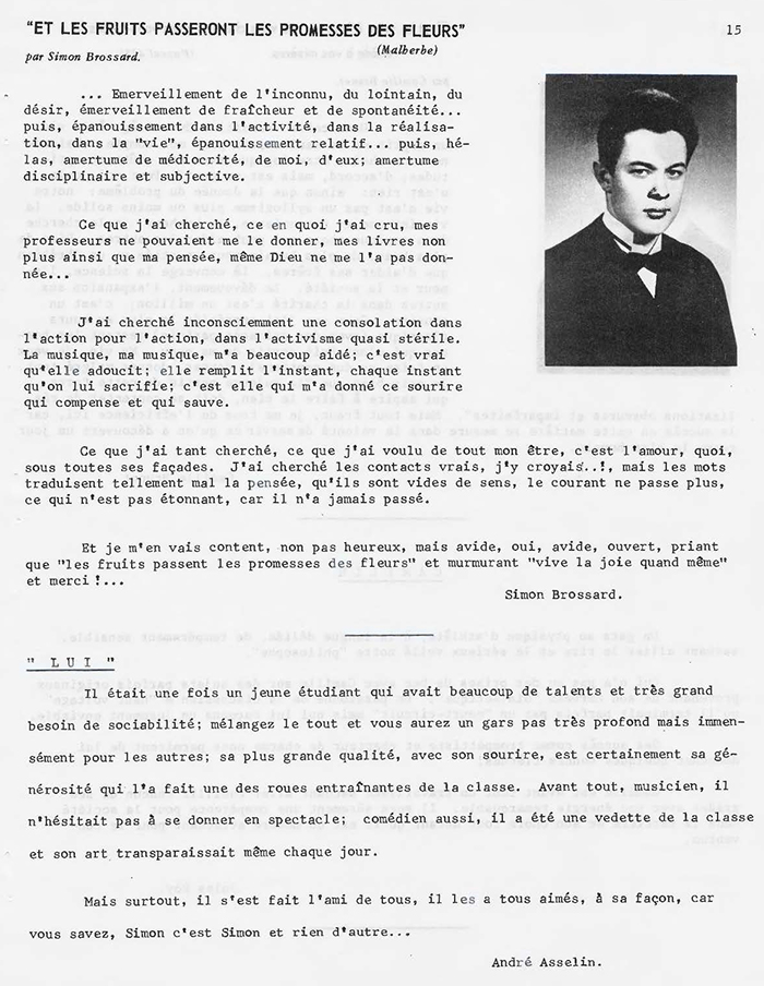 Parlant « musique », j'étais très impressionné par le remarquable talent de Simon Brossard. À l'orgue, par ses prouesses lors des Sept paroles du Christ de Théodore Dubois : voir Chorale sur la page musique. Mais aussi par ses talents d'improvisateur et d'oreille. Il savait brasser les pianos de la salle de musique par ses boogie-woogie endiablés ou par ses Brahms enflammés. Robert Derome 27 décembre 2012.