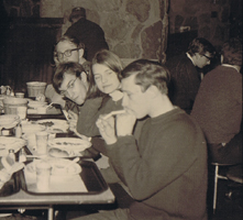 | À gauche. Probablement vers 1966-1967 lors d'une excursion de ski. À table, Jean-Paul BENOÎT, Robert DEROME, Sygne ROULEAU, peut-être André TREMBLAY, ainsi que deux À IDENTIFIER à droite en arrière. | |