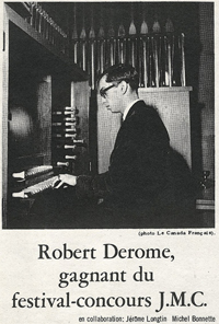 Je n'oublierai jamais les encouragements de l'abbé Maurice Girard, préfet des petits et professeur de musique, notre Don Camillo, qui prirent la forme de joyeuses escapades en auto à l'Oratoire Saint-Joseph, avec quelques autres élèves, afin d'y apprécier plusieurs récitals qui m'enrichirent considérablement. Puis, survinrent deux grands événements imprévus qui marquèrent, non seulement ma vie au collège, mais toute ma vie. En 1964, j'ai gagné mon premier prix au concours des JMC et, mon deuxième, en 1965. |