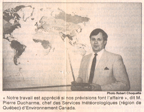 Robert Choquette, « Les météorologues, des mal aimés qui ne se trompent que très rarement - Ceux qui font la pluie et le beau temps... », Le Devoir, jeudi 4 février 1988, p. 13. Archives Michel Beaudin.
