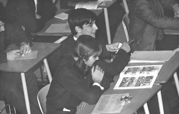 La jeune fille sur cette photo, lisant des bandes dessinées avec Pierre Cappiello en plein ‘Parlement-École’, serait-elle, comme le pense Louis Richer, Marie-Lyne Éthier du 58e cours ? Gilles Favreau à Carmen Bellerose courriel 1er juin 2012.
