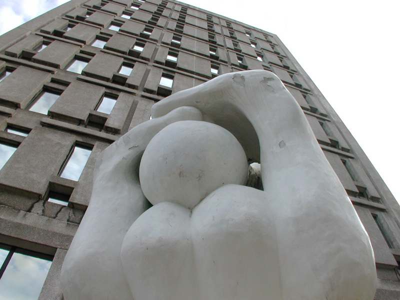 Contre plongée Ce point de vue, quoique jamais illustré, permet d'identifier l'oeuvre, car il véhicule la signification la plus largement répandue qu'en fait le public. De quoi se protège ce personnage dans son repli ? Avec ses deux mains en guise d'abri, a-t-il peur que le ciel ou l'immeuble ne lui tombent sur la tête ? |