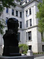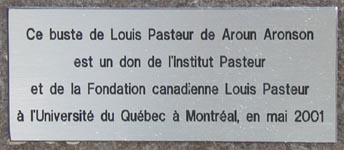 « Montréal, le 4 mai 2001 -- Un buste de Louis Pasteur a été dévoilé aujourd'hui sur la Place Pasteur, devant le pavillon Athanase-David de l'UQAM, par deux représentants de l'organisme donateur, l'Institut Pasteur de France, Marie-Hélène Marchand, secrétaire générale et Pierre-André Cazenave, professeur à l'Institut, en présence du recteur intérimaire de l'UQAM, Gilbert Dionne, du vice-doyen à la recherche de la Faculté des sciences, François Bergeron, du Maire de Montréal, Pierre Bourque, de la consule générale de France à Montréal, Françoise le Bihan, et du président de la Fondation canadienne Louis Pasteur, Michel G. Bergeron. L'UQAM est fière de contribuer à la valorisation du parc de la Place Pasteur en s'associant à la figure de l'éminent homme de science que fut Louis Pasteur et aux institutions qui ont pour mission de perpétuer son oeuvre.La Place Pasteur est devenue un lieu public dès 1823, par legs de Louis-Joseph Papineau. C'est un siècle plus tard, en 1922, à l'occasion du centenaire de Louis Pasteur, qu'il a pris son nom actuel par décision du Conseil municipal de Montréal. Une plaque a été apposée sur le terrain du parc en 1973 pour rappeler son cent cinquantième anniversaire; elle est maintenant restaurée et fixée au socle du buste. En 1991, l'achèvement de la construction du pavillon Athanase-David de l'UQAM a donné au parc sa forme actuelle. En 1999, la ville de Montréal a cédé pour dix ans la surface du terrain à l'UQAM, qui est responsable de son aménagement. » Source