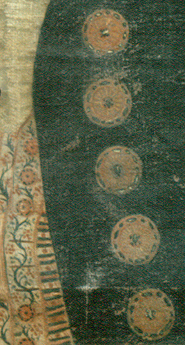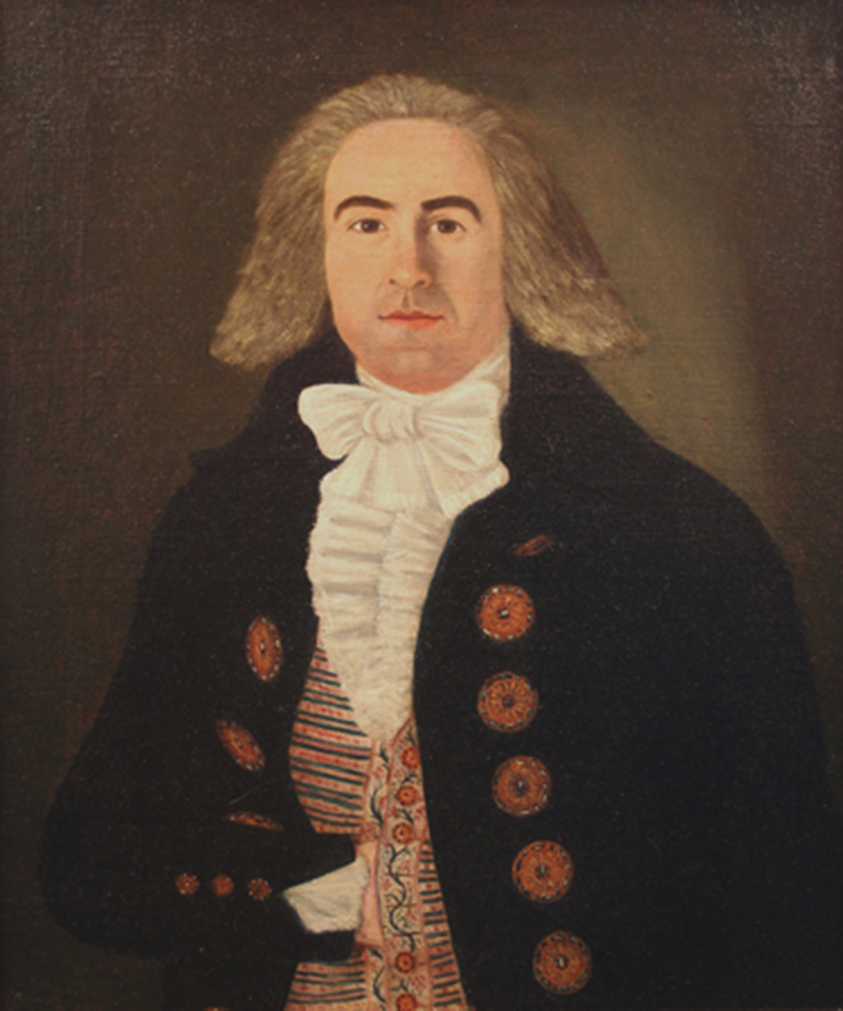 Anonyme, Portrait du négociant James Woolrich (1762-1823), fin XVIIIe, huile sur toile, Montréal, Musée du Château Ramezay 1998.957. Diapositive Robert Derome vers 1973 avant restauration et détail des boutons en forme de couettes d'orfèvrerie de traite. Photo après repeints sur Artefacts Canada.