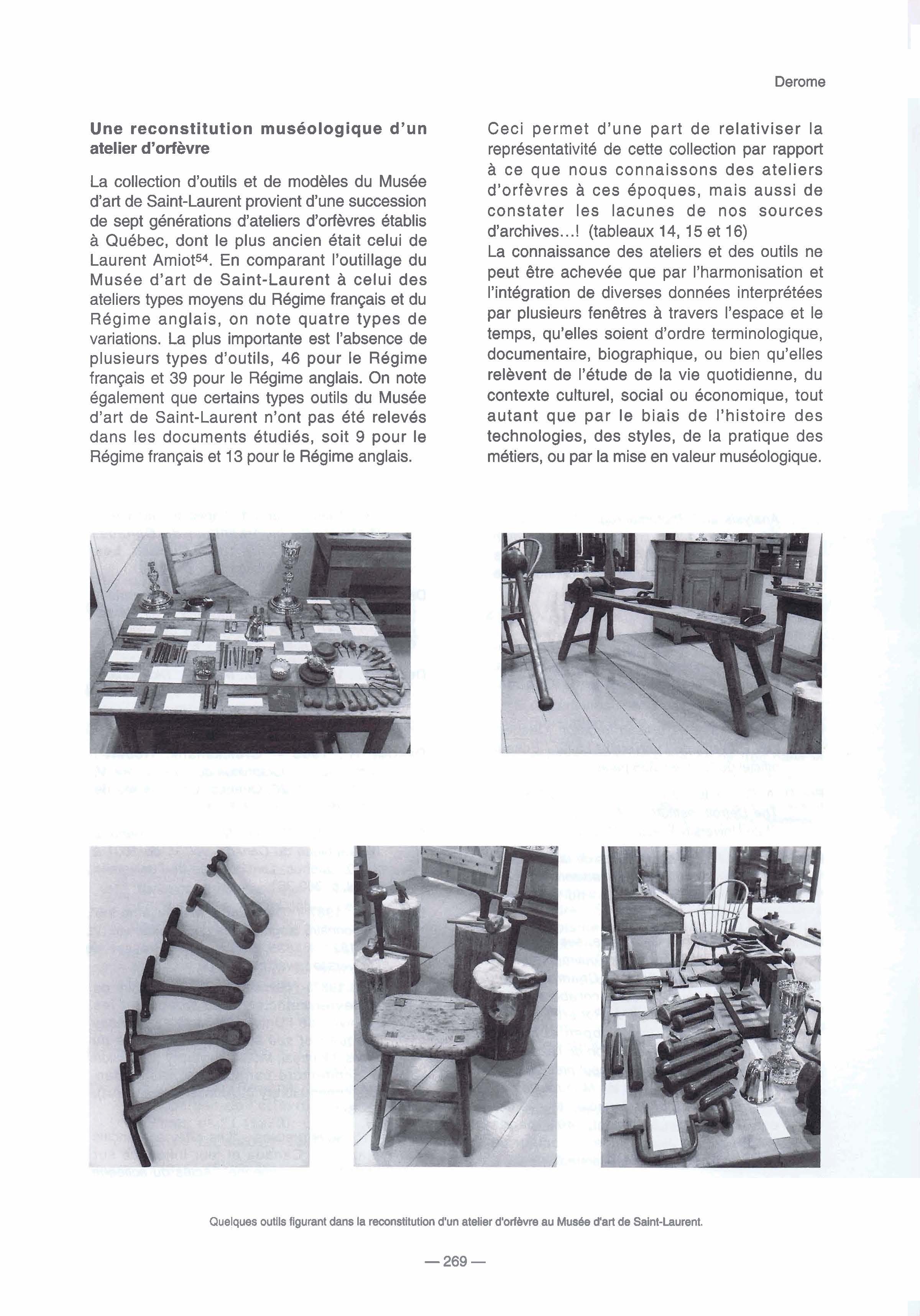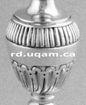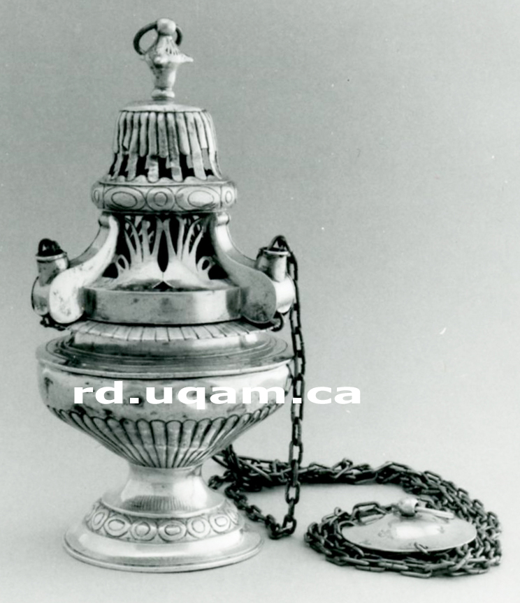 | Les ateliers comptant le plus de personnel sont ceux où se pratique non seulement l'orfèvrerie civile et religieuse, mais également celle pour la traite. Ignace-François Delezenne est le premier à le faire, sous le Régime français, avec Louis-Alexandre Picard (Derome 1980c) qui poursuit cette activité sous le Régime anglais en utilisant des outils spécialisés. Ayant appris le métier sur le tas, Joseph Schindler (Derome 1980d et Derome 1983c) va même s'installer brièvement à Michillimakinac sur les lieux de traite, tout comme d'autres orfèvres à Détroit. Formé au métier en Angleterre, Robert Cruickshank révolutionne la stylistique de cet art, mais l'ancien perruquier Pierre Huguet dit Latour lui fait concurrence. Les carrières de Dominique Rousseau (Derome 1987g ou web) et Narsise Roy (Derome 1983f ou web) dépendent de la traite, mais les grands orfèvres de Québec, tels François Ranvoyzé et Laurent Amiot, ne s'orienteront pas vers cette production proto-industrielle et n'auront besoin que de peu d'apprentis ou d'engagés. | ![]() |