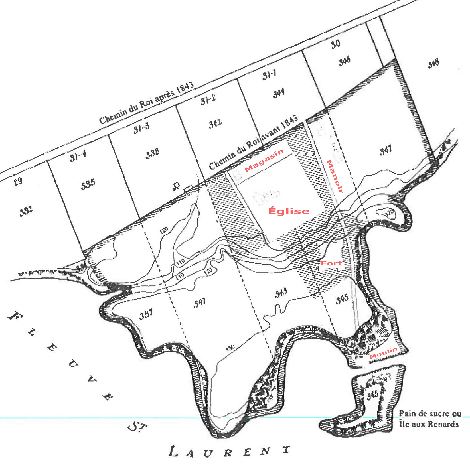 Plan synthèse du site de l'église de 1754 au coteau des Cèdres (Brazeau 2013.01, p. 25, avec annotations en rouge ci-dessus). |