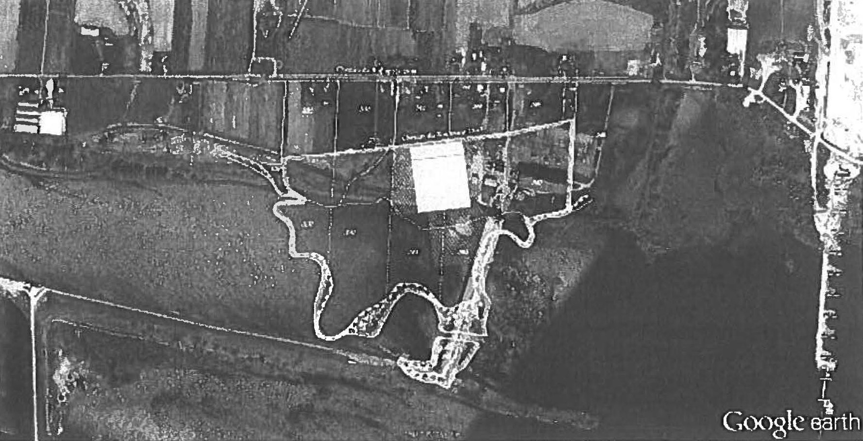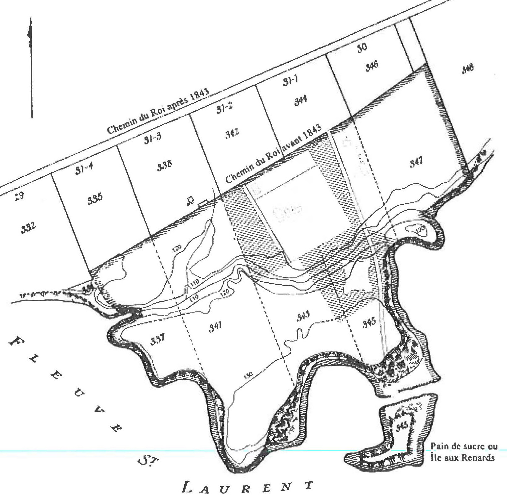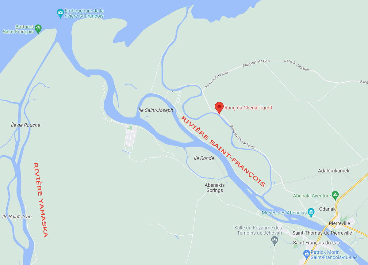 Superposition du plan synthèse (à gauche) sur le relevé de Google satellite en 2023 (Brazeau 2013.01, p. 39, ci-dessus reconstitué et annoté). |