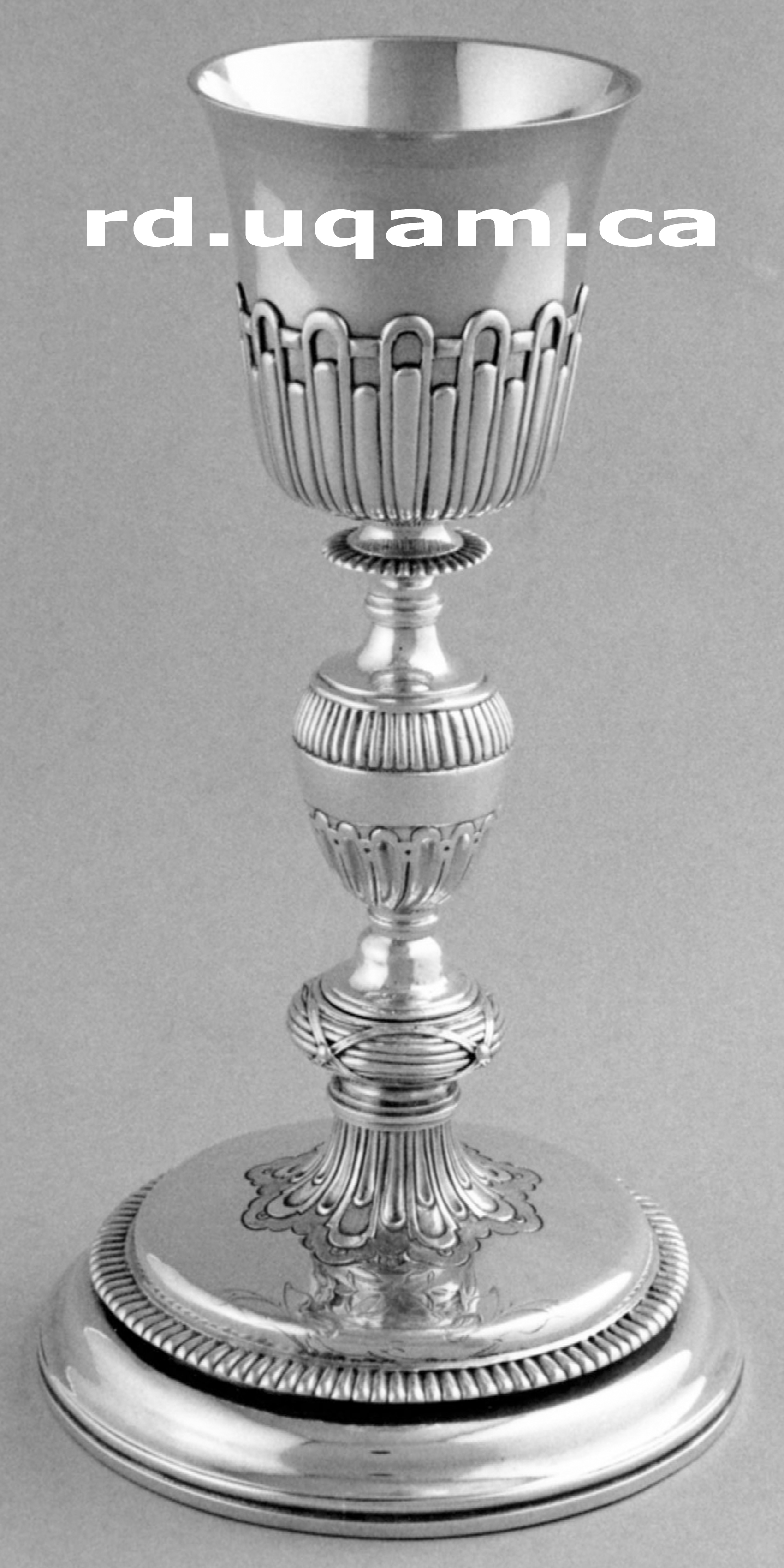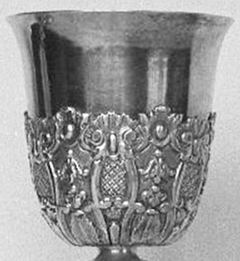 Charles Duval, Calice, 1817, argent et coupe dorée, 26 cm, poinçon CD, Verchères, photo RD alors que cet objet était en dépôt au Musée national des beaux-arts du Québec sous le n° L 60 1 0, ce qui n'est plus le cas (collaboration Daniel Drouin). |