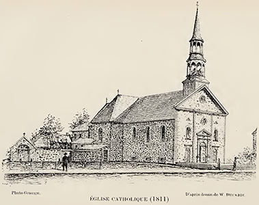 Le 10 avril 1837, Madelene You décède à Sorel (PRDH) où habite sa fille Julie (PRDH). Huit ans plus tard, le 8 février 1845, est inhumé à Repentigny « Charles Duval, ancien orfevre dans cette paroisse, décédé avant hier, muni des sacremens, agé de quatre vingt dix ans ». Selon le baptistaire le désignant comme « Jean », le 4 avril 1758, il aurait plutôt eu 86 ans et 10 mois à son décès. Un long silence documentaire enveloppe d’une ombre profonde les dernières années de sa vie. Église Saint-Pierre de Sorel, construite de 1826 à 1831 (Google et RPCQ). Église de Repentigny (détail), 1898, photographie (modifiée avec photoshop), 27,8 x 19,3 cm, Don de l'honorable Juge Baby, Musée du Château Ramezay 1998.3608. |