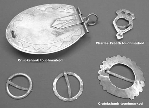 Après la Conquête de la Nouvelle-France par les britanniques, en 1759-1760, les frontières du Québec sont radicalement rétrécies. Suite aux doléances des marchands, l'Acte de Québec les élargit en 1774 aux territoires amérindiens où se pratique la traite des fourrures dans les Pays d'en haut, soit au-delà des Rapides de Lachine incluant les Grands Lacs jusqu'à Saint-Louis (Missouri). Durant leur guerre pour l'indépendance, les américains veulent bouter les britanniques hors de l'Amérique du Nord. C'est ainsi qu'ils envahissent le Québec en 1775, mais sont forcés de s'en retirer en 1776. La table est donc mise pour que Montréal devienne un important centre du commerce des fourrures auquel se greffe une formidable épopée de fabrication de milliers de bijoux en argent dont les Premières Nations sont friandes. En investissant le commerce de la fourrure, les clans écossais de Montréal choisissent l'un des leurs pour fabriquer quantité d'orfèvrie de traite. Né à Aberbrothock vers 1745, Robert Cruickshank effectue son apprentissage chez l'orfèvre londonnien Alexander Johnston du 4 avril 1759 au 9 avril 1766, ville où il travaille jusqu'en 1772. Il est actif à Montréal de 1774 à 1807 qu'il quitte pour un voyage en Angleterre où il décède en 1809 alors qu'il s'apprêtait à revenir. Son atelier est l'un des plus importants à cette époque, ayant formé et engagé de nombreux orfèvres (pour plus de détails voir Derome 1996).