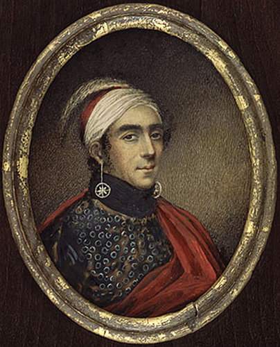 John Brant (1794-1832) est ici portraituré 6 ans après son décès avec de grandes boucles d'oreilles d'argent, une médaille sur la poitrine et son épée à la main.