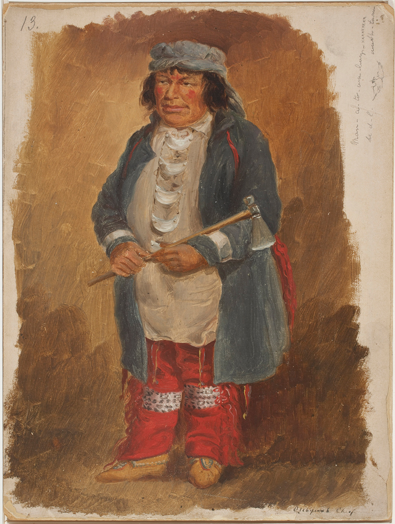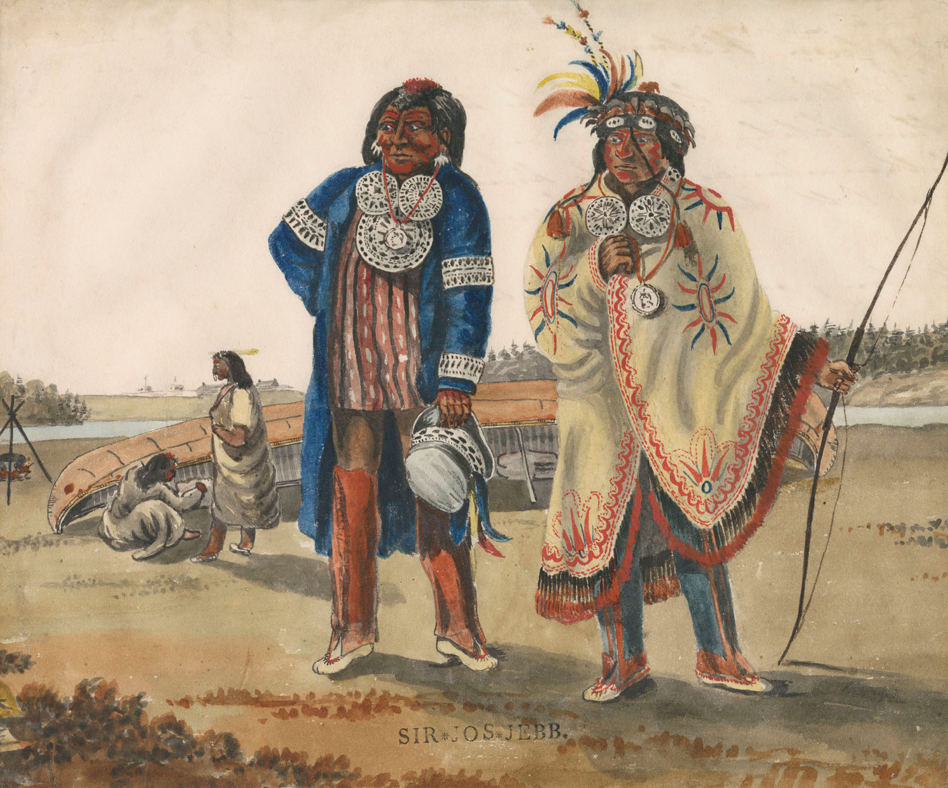 Joshua Jebb (1763-1823), Two Ottawa Chiefs Who with Others Lately Came Down from Michillimackinac Lake Huron to Have a Talk with Their Great Father The King or His Representative, vers 1813-1820, watercolour over pencil on wove paper, 29,5 cm, Ottawa, Bibliothèque et Archives nationales du Canada 2836441.