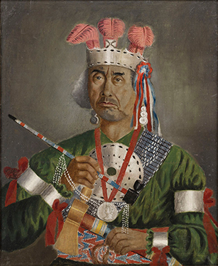 Zacharie Vincent (1815-1886), Telari-o-lin, chef huron et peintre, vers 1875–1880, huile et mine de plomb sur papier, 72,8 x 51,3 cm, don de la succession H. H. Lyman 1915, Musée Château Ramezay Montréal 1998.1098, 150 ans | 150 œuvres : l’art au Canada comme acte d’histoire, Galerie UQÀM et Musée virtuel.. |