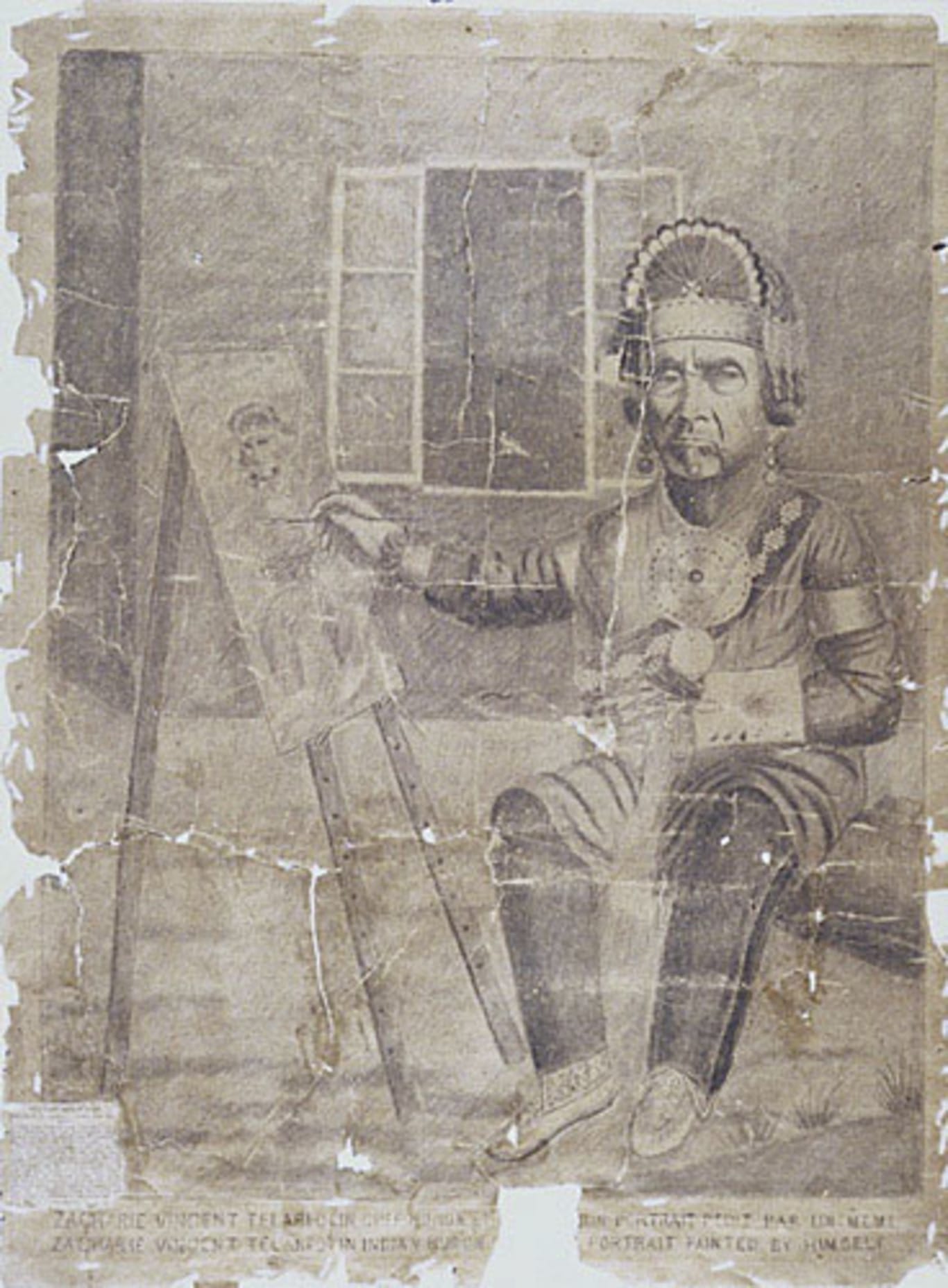 Zacharie Vincent (1815-1886), Zacharie Vincent Telariolin chef huron et son portrait peint par lui-même, vers 1875, Fusain sur papier, 65,4 x 49,6 cm, Musée national des beaux-arts du Québec 1934.529. |