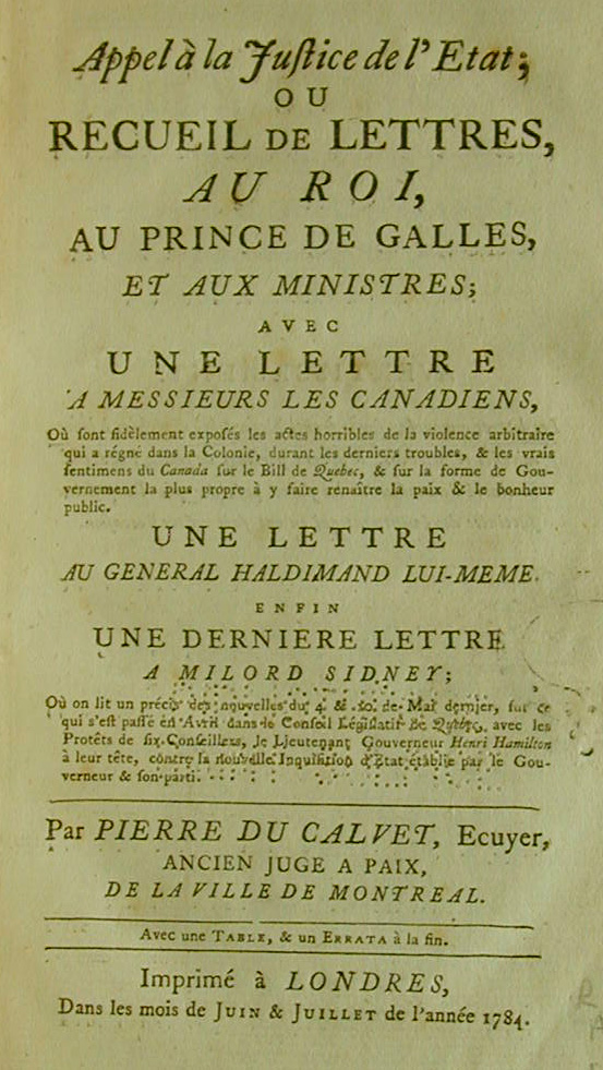 Pierre du Calvet (1735-1786), Appel à la Justice de l'État ou Recueil de Lettres au Roi, au Prince de Galles, et aux Ministres [...], London, [s. é.], 1784, xiv, -320-viii p., 22 x 14 cm, in 8N, Montréal, Bibliothèque nationale du Québec. Photo Robert Derome. |