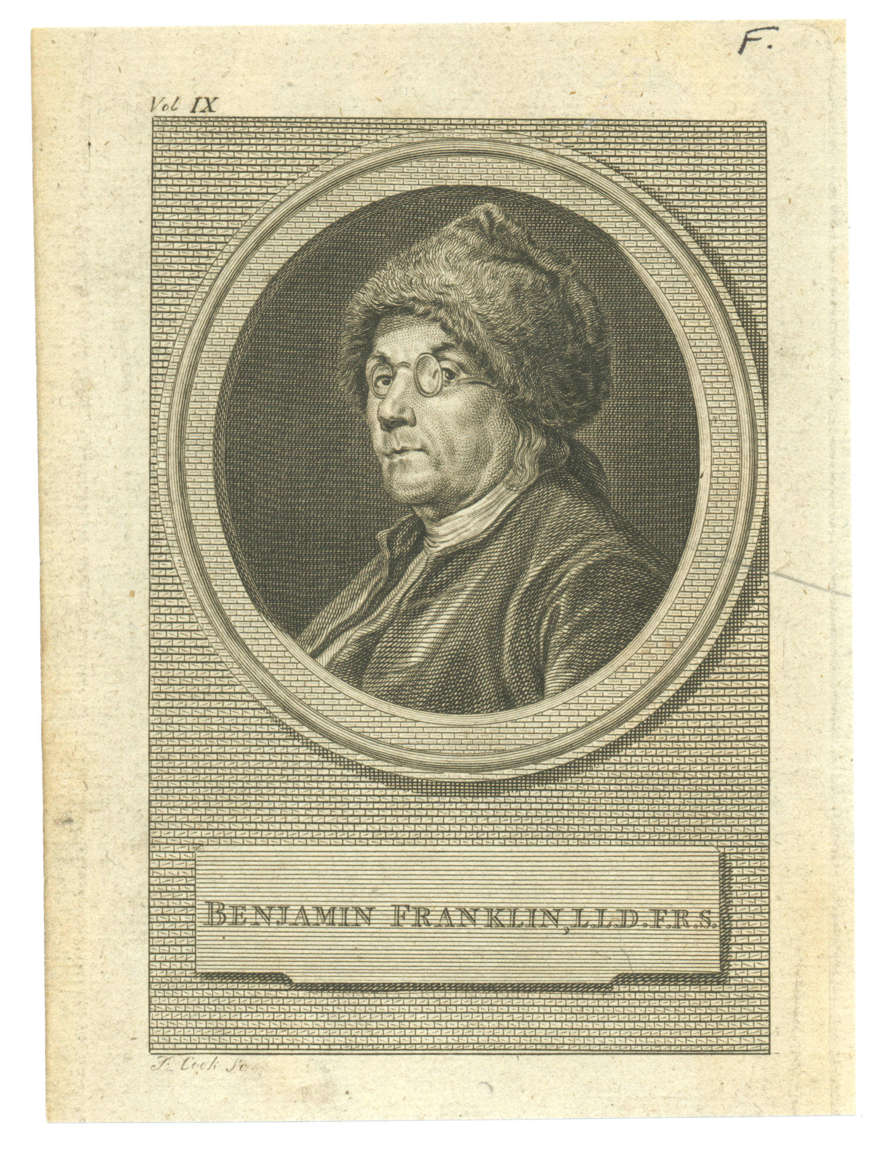 J. Cook, Portrait de Benjamin Franklin (1706-1790), XVIIIe siècle, gravure, 13,6 x 8,9 cm, Montréal, Musée du Château Ramezay, 1998.2432. Photo Robert Derome. |