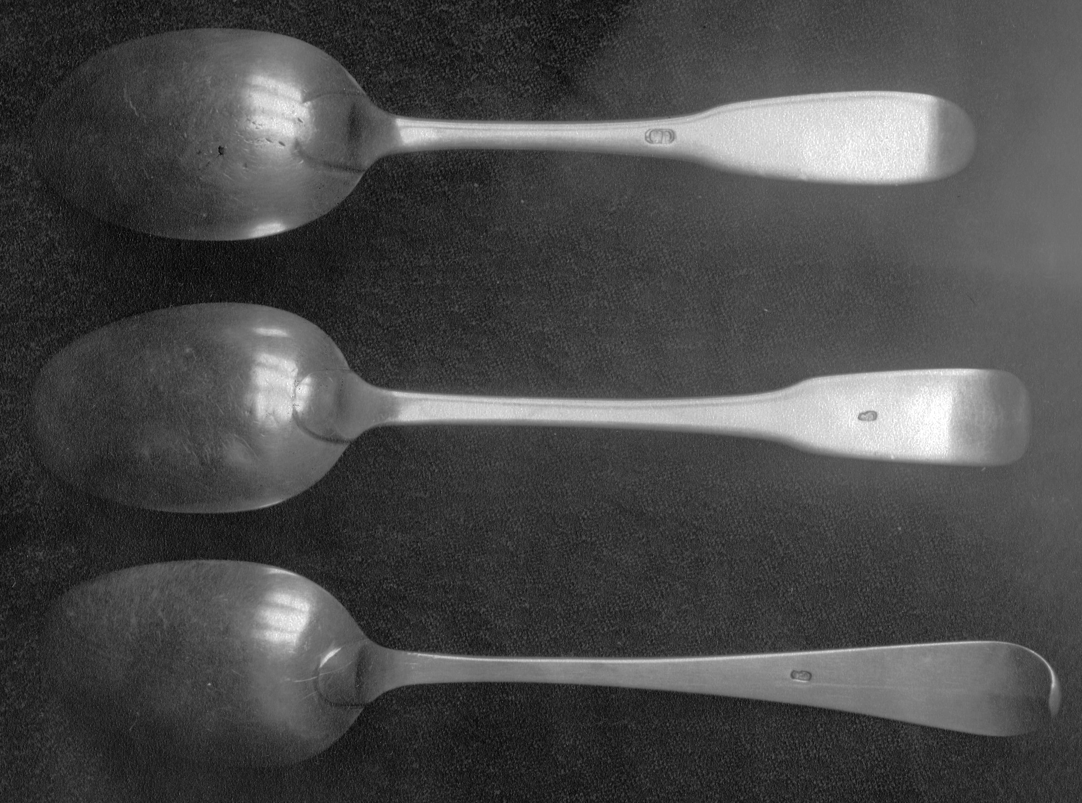 Ces identifications qui datent de 1950 sont sujettes à caution : 1 - Cuiller par Louis-Pierre Boivin [plutôt Léandre-Pierre Boivin]. 2 - Cuiller par Pierre Huguet. 3 - Cuiller par Louis Huguet [poinçon de Louis Haldimand dont photos ci-dessous]. 4 - Cuiller par KH (un des Huguet) [plutôt Kurczyn & Haldimand]. 5 - Cuiller par PH (Pierre Huguet). 6 - Pincettes par IL (probablement John Lumsden) [plutôt Joseph Lucas], BANQ E6,S8,SS1,SSS633,D2934, photo IOA 1950.