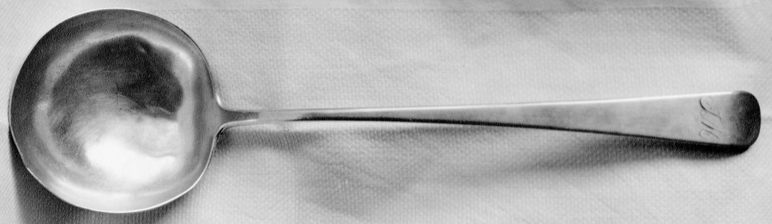 Cette description par Gérard Morisset, « CUILLER à potage, en argent massif ; éperons. Belle matière parfaitement polie. L. 0' 8 3/8" Poinçons : LH / LION / FLEUR (Louis HUGUET) I-113 [IOA, Montréal Hôtel-Dieu] », correspond au poinçon de Louis Haldimand figurant sur les photos ci-dessous de cette cuiller d'un style début XIXe siècle.
