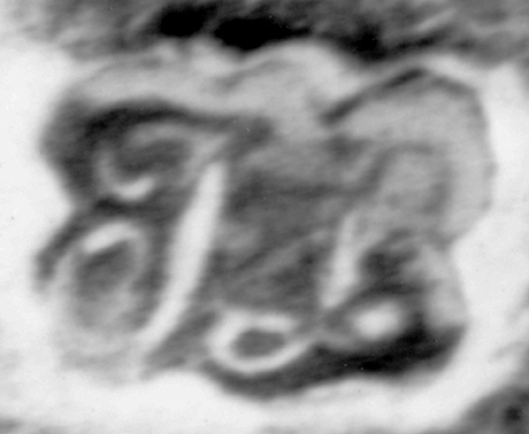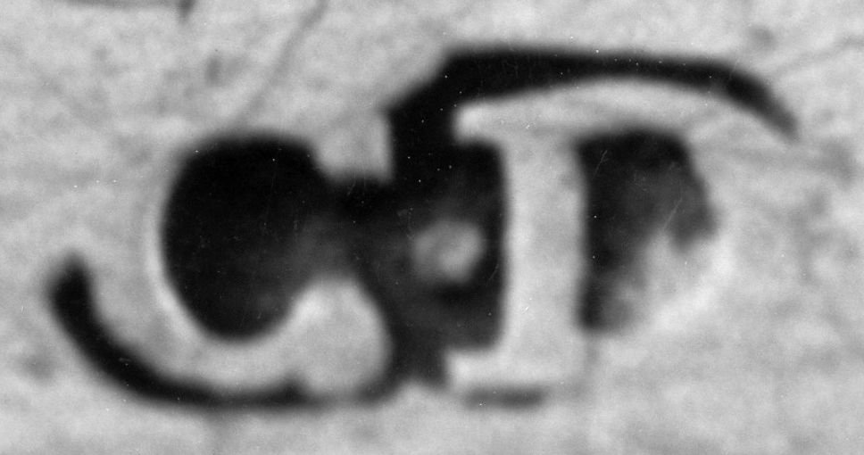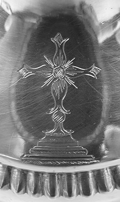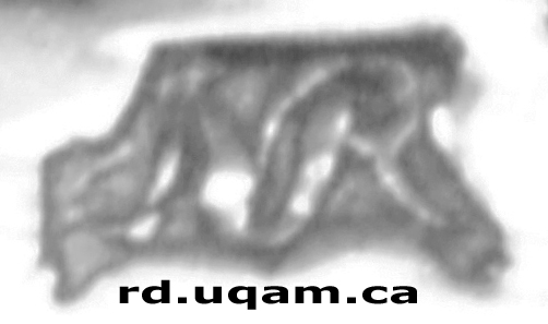 Duval a souvent insculpé son poinçon sur l'étroite bordure verticale de la bate, petite moulure à la base des vases religieux, où il se trouve ainsi à l'étroit et sujet à des déformations. Le poinçon ci-contre du calice bien documenté de Verchères porte un petit redent comme ceux du calice de Vaudreuil et de l'encensoir de Birks. Ce poinçon est souvent incomplet et déformé comme sur les calices de Longueuil — Saint-Hubert et de Birks où on ne distingue pas ce redent. Il est donc difficile à interpréter puisqu'il peut également ressembler au poinçon différent de la cuiller à potage ci-dessous ! |