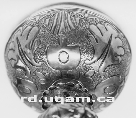 L'intervention de Duval sur le calice de Longueuil — Saint-Hubert révèle que la coupe est un gobelet domestique pouvant provenir des collections d'orfèvrerie française de l'ancien château fort de Longueuil, alors que le pied porte un décor du plus grand orfèvre de Nouvelle-France, Paul Lambert dit Saint-Paul. |