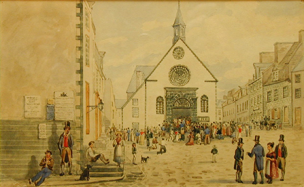 James Pattison (ou Patterson) Cockburn (1779-1847), L'église et la place du marché de la basse-ville de Québec, vers 1821-1832, aquarelle, 15,3 x 23,9 cm, Québec, Musée de la civilisation, dépôt du Séminaire de Québec, 1993.23300. Photo Robert Derome.