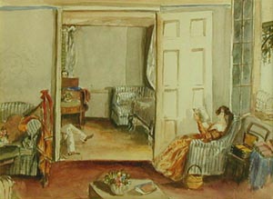 Jane Ellice, accompagnée de sa soeur Églantine Balfour, arrive à Québec avec son mari Edward junior en 1838. Celui-ci agit à titre de secrétaire particulier de Lord Durham, gouverneur du Bas-Canada et auteur du controversé rapport. Jane emporte avec elle un journal qu'elle tient à la demande de son beau-père. Elle y raconte ses voyages au Canada et aux États-Unis, ainsi que ses réflexions sur les Rébellions, pendant lesquelles Jane et sa soeur sont confinées au manoir de la seigneurie de Beauharnois. Artiste aguerrie, Jane Ellice saisit, par un cadrage efficace, le charmant désordre d'un instant privilégié dans la pratique intime des arts et des lettres. On y voit une guitare ou un violoncelle sur un fauteuil, les jambes d'un protagoniste assis, un homme qui joue du piano, une femme lisant et des livres posés un peu partout, de même qu'une boîte d'aquarelles.