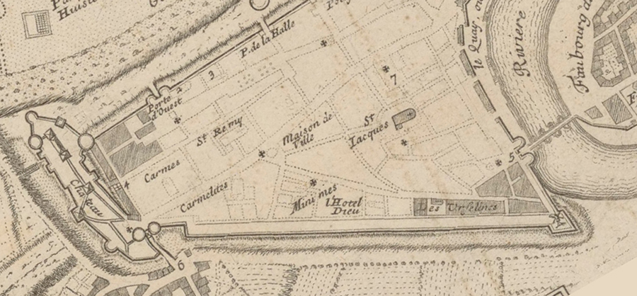 Détail des fortifications, avec ajustement de l'orientation afin de correspondre à celle de la vue de Silvestre ci-dessus, montrant l'emplacement de l'Hôtel-Dieu situé le long des fortifications entre les carmélites et les minimes (à gauche), et les ursulines (à droite), par rapport à l'église Saint-Jacques. Cette carte a été dessinée en 1695, après le bombardement de 1694 par les anglais tel qu'indiqué sur la légende.
