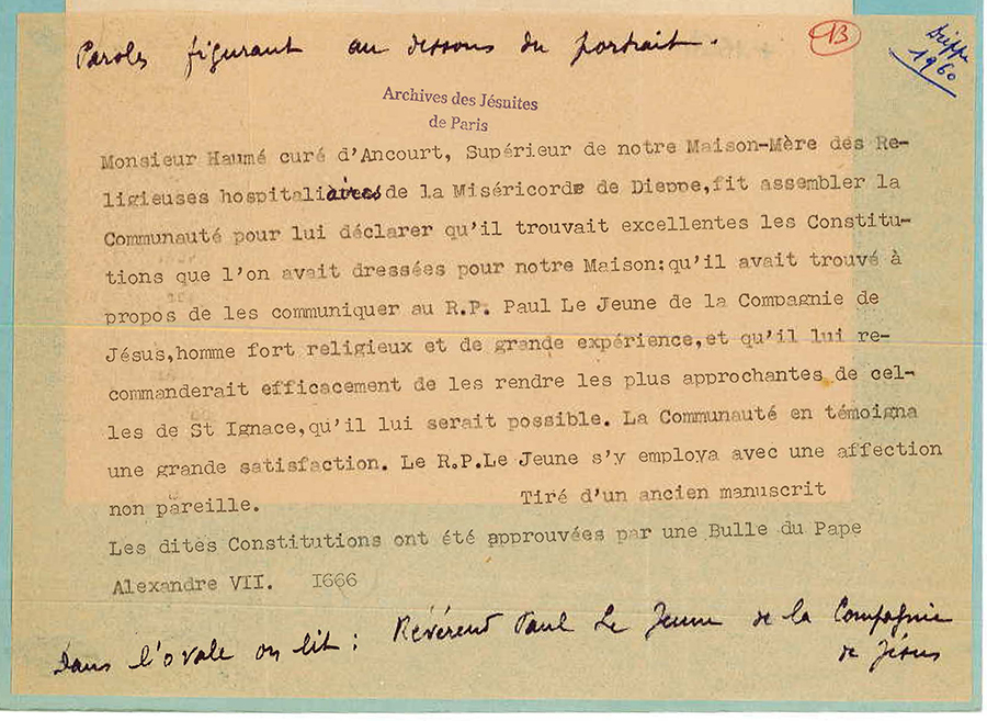 Monsieur Haumé curé d'Aucourt, Supérieur de notre Maison-Mère des Religieuses hospitaliaires (« e » rayé, « ai » en surcharge) de la Miséricorde de Dieppe, fit assembler la Communauté pour lui déclarer qu'il trouvait excellente[s] les constitutions que l'on avait dressées pour notre Maison, qu'il avait trouvé à propos de les communiquer au R. P. Paul Le Jeune de la Compagnie de Jesus, homme fort religieux et de grande experience, et qu'il lui recommanderait efficacement de les rendre les plus approchantes de celles de St Ignace, qu'il lui serait possible. La Communauté en témoigna une grande satisfaction. Le R. P. Le Jeune s'y employa avec une affection nonpareille.Tiré d'un ancien manuscrit.