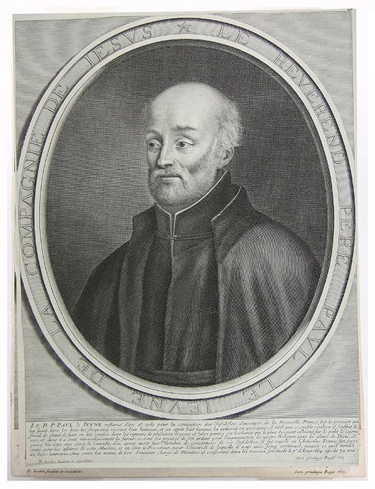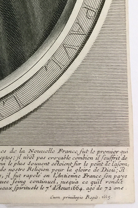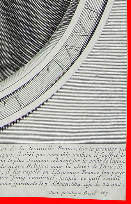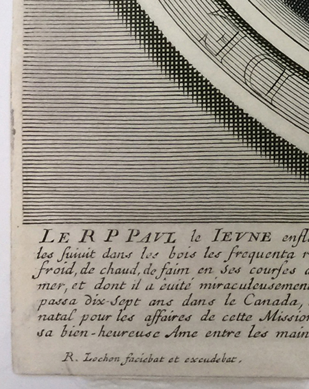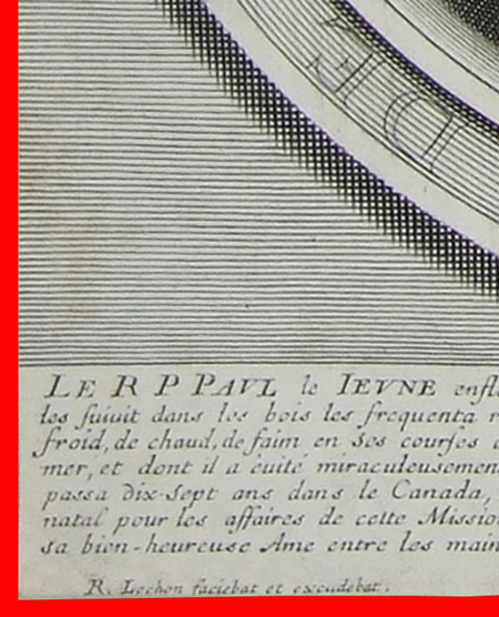 Grâce à la collaboration exceptionnelle du collectionneur Denis St-Martin (CStM) et son collègue photographe Germain Martin, nous pouvons maintenant en étudier un autre exemplaire avec des numérisations de grande qualité. Réné Lochon (1636-1675), LE REVEREND PERE PAVL LE IEVNE DE LA COMPAGNIE DE IESVS, 1665, Gravure sur papier de 35,3 x 26,5 cm collée sur une autre feuille portant un filigrane sur laquelle on a ajouté à l'encre le chiffre « 68 » et marquée au verso à la position quatre heures « 120114 HD » au crayon, Collection Denis St-Martin (CStM), acquise vers 2010 de la marchande Colette Mass à Paris. Voir aussi : Les 2 Rives ou pdf. |