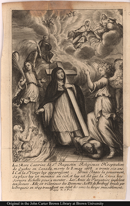 Une plaque usée reproduit le même dessin, mais son altération des détails s'accentue au fur et à mesure des réimpressions. Ce qui peut être le cas d'une reproduction ultérieure au XVIIe siècle. C'est ce qu'il advint pour la gravure La Mere Caterine de St. Augustin Religieuse Hospitaliere de Quebec en Canada… Créée avant novembre 1670 et très demandée, elle fut réimprimée sur des feuilles volantes, en 1755, après que le jésuite René Duval (1706 - après 1758), procureur des hospitalières à Paris, eût retrouvé la planche de cuivre originale (Martin 1988, p. 39). De nos jours, il existe toujours un marché actif de reproductions dites « historiques » [source : muzeo ou pdf]. On distingue bien les plis effectués pour insérer cette gravure dans son livre de destination. Bien que beaucoup plus petite que celle de Le Jeune, cette feuille devait être pliée pour s'insérer dans l'ouvrage de Ragueneau 1671, in-8°, soit, selon la table de Morel, grand in-8° (25 à 32 cm), in-8° (22 à 24 cm), petit in-8° (18 à 20 cm). Jean Patigny (actif 1660-1670), La Mere Caterine de St. Augustin Religieuse Hospitaliere de Quebec en Canada…, avant novembre 1670, gravure sur papier, image 16,8 x 12,2 cm, feuille 21,8 x 15 cm, signé en bas au centre « Patigny In. Et Fecit », planche frontispice dépliante dans Ragueneau 1671. Photo : Brown University, John Carter Brown Library. |