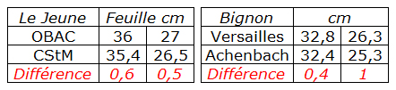 Une petite différence d'un demi centimètre, tant sur la hauteur que sur la lageur, est compatible avec le fait que les marges de la CStM ont été rognées sur les quatre côtés. Toutefois ces mesures sont toutes relatives, puisque ces feuilles sont de formes très irrégulières et aucun de leurs coins n'est à angle droit : il n'est donc pas acquis que les mesures ont été prélevées de la même façon. Par contre, seules des mesures prises de façon très différentes peuvent expliquer les écarts de plus de 4 cm dans les dimensions de l'image, ainsi que dans la hauteur de celles de l'image et du texte. Les différences sont perceptibles dans les éléments gravés du contour où l'exemple de OBAC montre des détails supplémentaires.