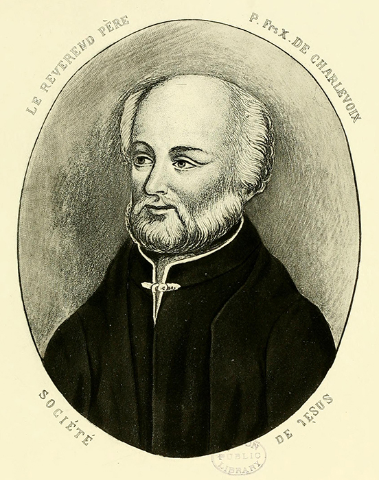 Alfred Hamy (1838-1904) s'est beaucoup intéressé aux images, tel qu'en fait foi son imposant recueil Galerie Illustrée de la Compagnie de Jésus, Album de 400 portraits choisis parmi les plus beaux, les plus rares ou les plus importants, et reproduits, en héliogravure (Hamy 1893), d'où est tiré ce portrait de Charlevoix par un graveur anonyme. Il tire certainement sa source de celui de Duncan : même style de miniature, dans un ovale, avec les petites touches du pinceau dans le fond ; même physionomie du portraituré dans son ensemble et ses détails. Il découle donc de la même source : un portrait à Caughnawaga, aujourd'hui disparu. Pensant d'abord qu'il s'agissait de Charlevoix, son identification fut ensuite modifiée pour Le Jeune. Il partage la même orientation vers la gauche que 1665 Lochon OBAC.