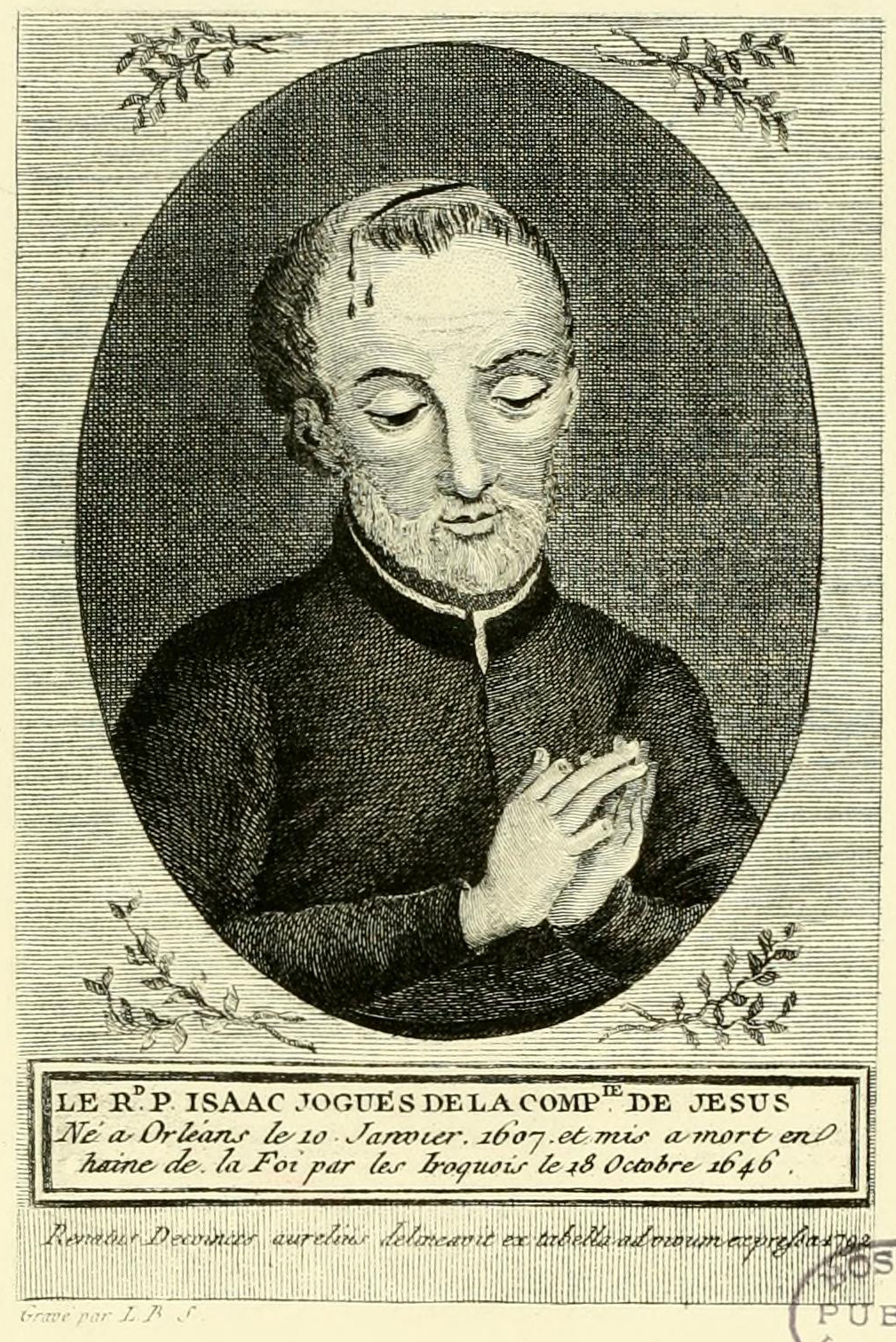 L.B. graveur d'après le dessin d'un tableau ancien par Renatus Decoin[ces? ees? us?] aurelius, « LE Rd. P. ISAAC JOGUES DE LA COMPie. DE JESUS | Né à Orléans le 10 Janvier 1607 et mis a mort en | haine de la Foi par les Iroquois le 18 Octobre 1646 », 1792, « Renatus Decoin[ces? ees? us?] aurelius delineavit ex tabella ad vivum expreſsas 1792 », « Gravé par L.B. ſ. », Hamy 1893, image non paginée. Voir aussi : Alfred Hamy's Jesuit Portrait Gallery, Marquette University, Raynor Memorial Libraries. |