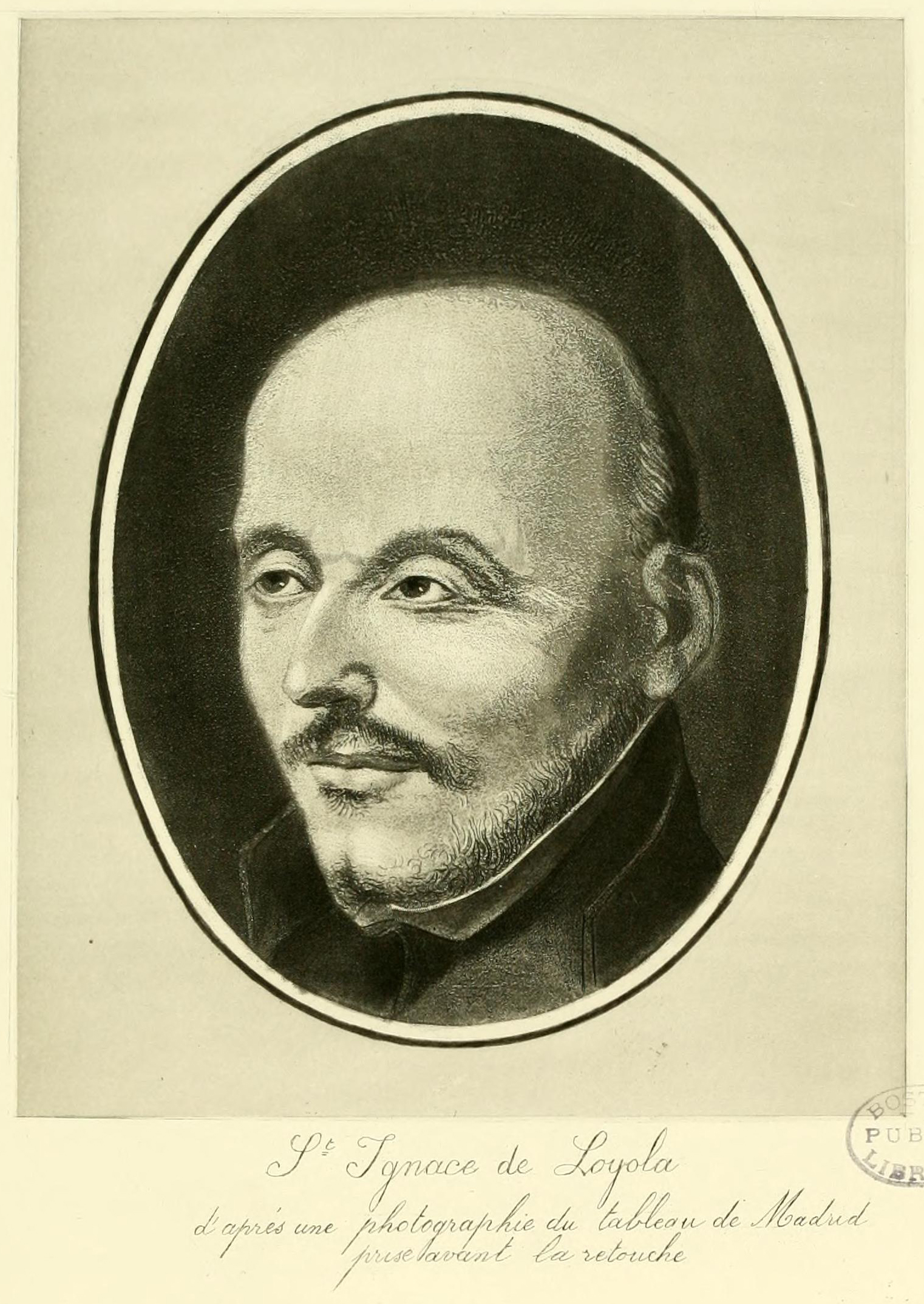 « Loyola (Saint Ignace de). [...] Il est impossible de lire la relation manuscrite du Frère Cristobal Lopez (1), socius du Père Ribadeneira, telle qu'on l'a imprimée en appendice dans le 1er volume de Cartas de S. Ignacio, sans admettre que, de tous les portraits de saint Ignace, celui de Madrid est le seul qui ait une valeur historique. C'est aussi le seul qui reproduise la conformation de la tête sans déformation, le seul qui donne à la physionomie du saint un cachet en rapport avec son caractère : fermeté, vertu et amour de Dieu. La planche gravée pour la Galerie est la reproduction d'une photographie sur papier faite d'après le tableau de Madrid, avant qu'on ait eu la malheureuse idée de le faire retoucher. Quand il s'agit d'un document, le plus sage est d'en prendre une copie exacte, pour éviter de changer le moindre trait. Il paraît que l'artiste chargé du travail, par excès de zèle, n'a pas su respecter l'original. Aussi, les photographies prises avant la retouche n'en ont-elles que plus de valeur, au point de vue de la vérité.