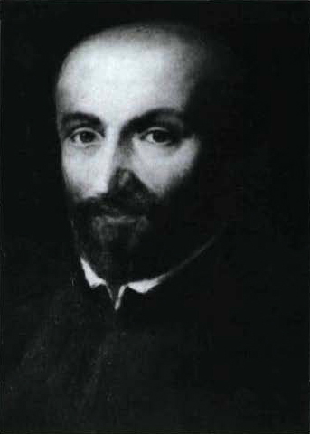 Jacopino del Conte (1510–1598), Ignace de Loyola (Inigo Lopez de Loyola 1491-1556) "portrait véridique" (détail), 1556, Huile sur toile, 46 × 35 cm, Rome, Curia Generalizia della Compagnia di Gesù. Photo : akg ; voir aussi Fondazione Federico Zeri (web ou jpg). |