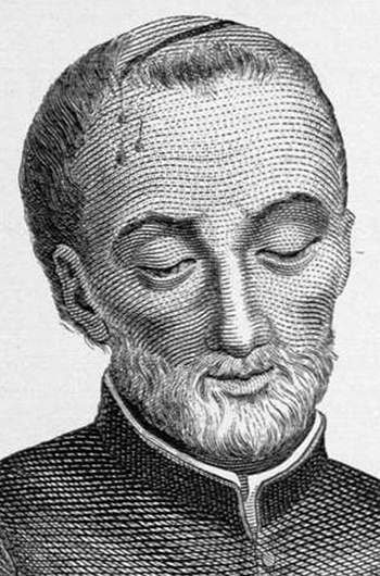 Cette illustration pourrait participer du renouveau de l'iconographie jésuite au XXe siècle, rappellant celle des Brébeuf et Marquette. Cette imagerie se retrouve dans des dépliants, périodiques, livres, sites religieux, sans mention de l'auteur du portrait ni de sa source précise. Difficile donc de retrouver un de ces portraits dans les archives des jésuites sans avoir de référence plus exacte ! Ce sont pratiquement des portraits robots sans âme dans un temps suspendu. Et, se ressemblant beaucoup, ils sont pratiquement interchangeables, pouvant être identifiés à l'un ou l'autre jésuite...! La reproduction est mauvaise, mais le visage représenté a une forme triangulaire, le personnage y est chauve et apparemment barbu. Il ne ressemble aucunement aux autres modèles de Le Jeune. Pourrait-il s'agir d'un autre jésuite ? Afin d'essayer de déterminer de quel jésuite il pourrait s'agir, examinons les portraits d'Isaac Jogues et de Gabriel Lalemant qui, tous deux, présentent des visages triangulaires, ainsi que ceux des martyrs jésuites et du fondateur de l'ordre, Ignace de Loyola. |
