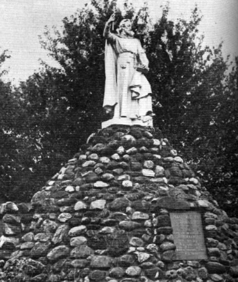 En 1888, Martin avait enlevé les marques de tortures du visage et présenté Jogues dans un portrait chauve et barbu plus serein. Sibbel pousse la transformation beaucoup plus loin. Le martyre n'est plus évoqué que discrètement, par la hâche au pied du saint. La représentation est à l'image de l'église de cette période : rayonnante et triomphante. Elle décore le principal lieu de formation des prêtres américains, construit en 1896, le Saint Joseph's Seminary (Dunwoodie). Une autre version est érigée à Auriesville en 1922 (photo et source). Les successeurs de son atelier enregistrent un copyright sur cette oeuvre en 1930 (source). Jogues brandit la croix, rustique en bois rond, d'un bras levé et dominant qui n'est pas sans rappeler l'iconographie de saint François-Xavier. Les saintes écritures sont tenues de la main gauche. Cette transformation radicale se conclut sur un visage radieux et serein, chevelu et barbu. Ces modifications iconographiques sèment d'ailleurs la confusion, car cette oeuvre sera méprise pour la sculpture de Marquette par Trentanove. Joseph Sibbel (1850-1907), Isaac Jogues, vers 1896, Sculpture, Saint Joseph's Seminary (Dunwoodie). Photo : source et collaboration Michael Daum. |