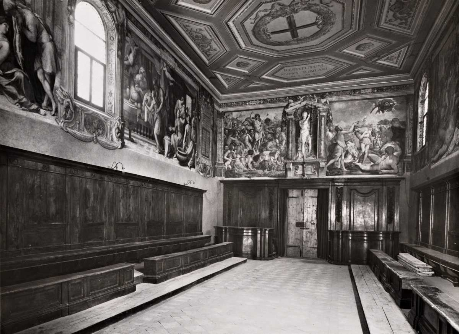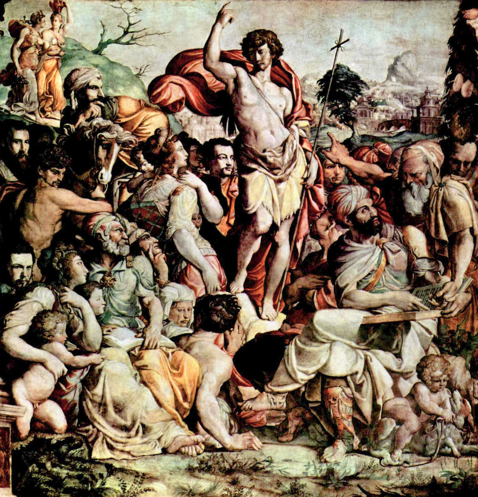Jacopino del Conte (1510-1598), Prédication de saint Jean-Baptiste 1538 et Baptême du Christ 1541, Fresques, Rome, Oratorio di San Giovanni Decollato. Photos : ensemble ci-dessus, Web Gallery of Art (web ou jpg) ; détail de la Prédication..., de l'homme à l'écharpe et de son visage, Associazione culturale Isidora (web ou jpg) ; la murale dans l'oratoire, Pinterest (web ou jpg), Fondazione Federico Zeri (web ou jpg), et Stefano Castellani pour l'Archiconfraternita di san Giovanni decollato (web ou jpg) ; dessin préliminaire de Piero Buonaccorsi dit Perino del Vaga (1501-1547), Prédication de Jean-Baptiste, 1538, 21,7 x 23 cm, Albertina 23751 ou jpg (Cheney 1970.03 p. 35). Henneberg 1967.06 soutient que le visage à gauche de saint Jean-Baptiste, dans cette fresque de Jacopino del Conte, est celui d'Ignace de Loyola, en se basant sur une ressemblance avec son portrait posthume et leurs biographies, arguments discutables qui mériteraient d'être étayés par d'autres sources plus probantes. Ce serait un rare portrait de Loyola peint de son vivant, soit en 1538, alors que le peintre et son modèle étaient très proches (« an identification which I do not find convincing [Cheney 1970.03, p. 39 note 51] »). Trois éléments définissent l'identité de cet homme : le vêtement, la chevelure et l'âge apparent. Del Conte a peint plusieurs portraits d'hommes, majoritairement vêtus de noir (Cultura Italia un patrimonio da esplorare). Portant cette couleur, celui-ci pourrait donc être un laïc. Mais son vêtement ne ressemble pas à celui d'un jésuite, surtout avec la grande écharpe colorée (partiellement recouverte par le vêtement noir du bras de la protagoniste de gauche) habillant son encolure et sa poitrine. Portée négligemment, celle-ci confère un caractère frondeur et bohème qui ne sied pas à un jésuite.