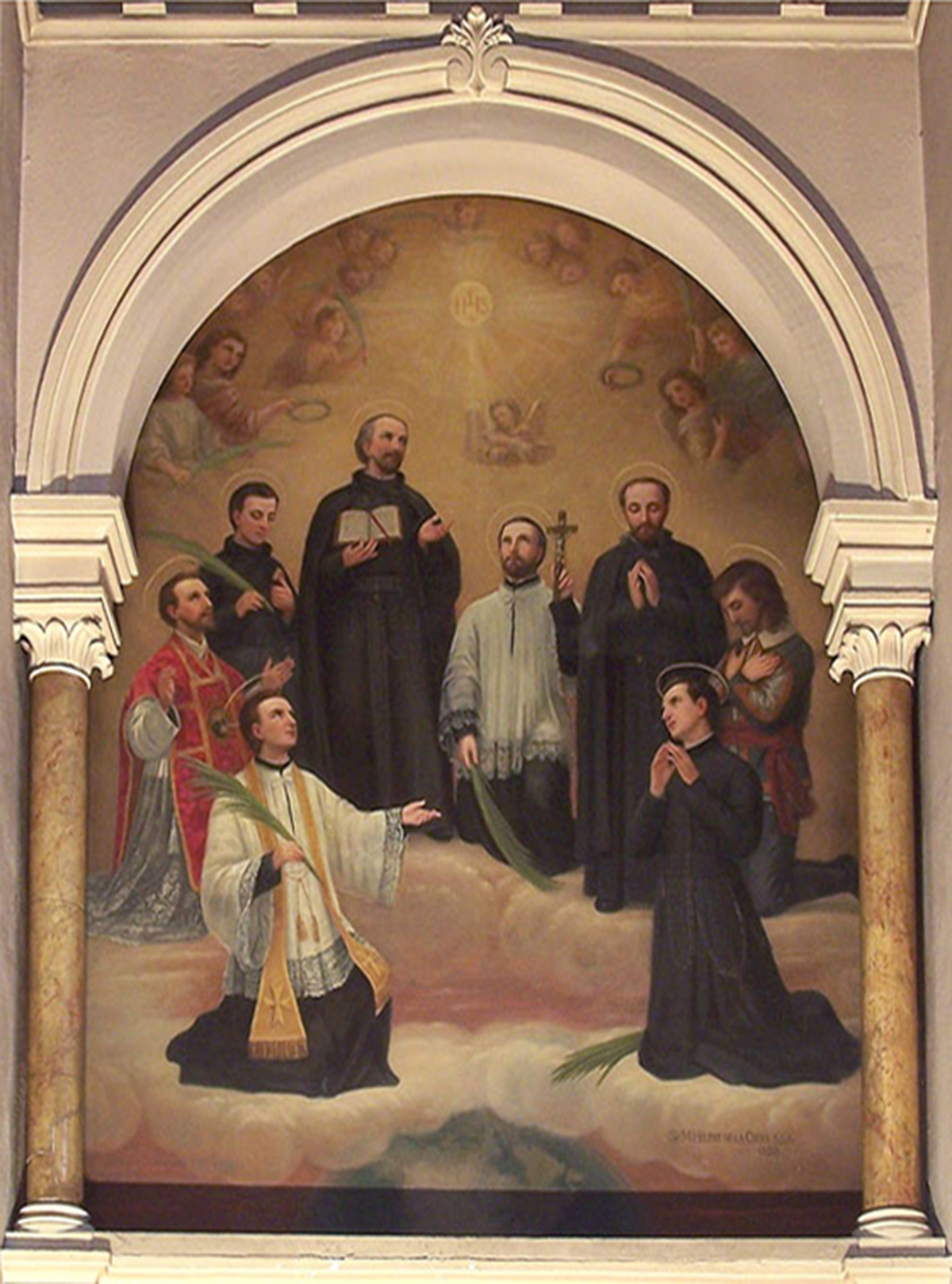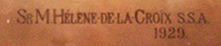Élisabeth Martin (Marie-Hélène-de-la-Croix, religieuse de la Congrégation des Soeurs de Sainte-Anne), Saints Martyrs canadiens, 1929, huile sur toile marouflée, en bas à droite « Sr M. Hélène-de-la-Croix s.s.a. | 1929 », incription en haut au centre « IHS », Montréal, Église Immaculée-Conception, RPCQ. |