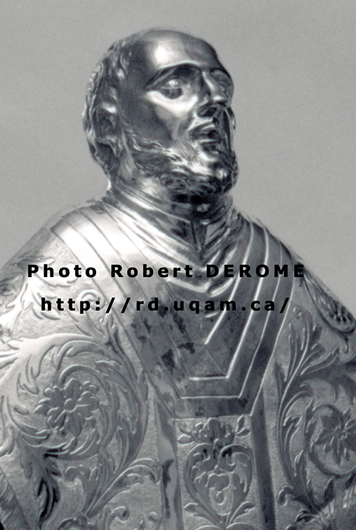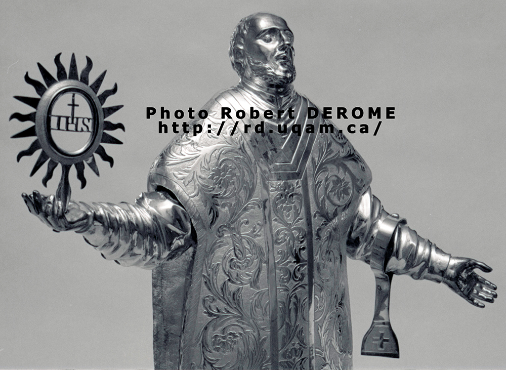 Cette remarquable sculpture sur bois a été réalisée un demi-siècle après le décès de Loyola. Les jésuites de la Nouvelle-France ne furent pas en reste avec cette magnifique pièce d'orfèvrerie, de 11 marcs 4 onces, qui décorait leur collège à Québec (Trudel 1974a, p. 121-122, n° 54).